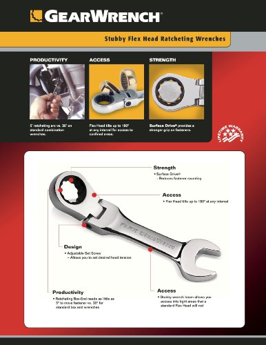 KDT9570 Features: -Flex head tilts up to 180 degrees at any interval.-Surface drive provides a stronger grip on fasteners nearly eliminating rounding.-Ratcheting box end needs as little as 5 degrees to move a fastener.-GrearWrench products are warranted for life to be free of defects in material and workmanship This gear wrench set is very unique because it needs as little as 5 degrees to move a fastener. The stubby wrench beam allows you access into tight areas, and the adjustable set screw allows you to set the desired head tension. The flex head tilts up to 180 degrees at any interval. The sizes include 3/8-Inch, 7/16-Inch, 1/2-Inch, 9/16-Inch, 5/8-Inch, 11/16-Inch and 3/4-Inch . .-7 Piece SAE Stubby Flex Gear Wrench Set. Includes: -Set includes: 3/8-Inch, 7/16-Inch, 1/2-Inch, 9/16-Inch, 5/8-Inch, 11/16-Inch and 3/4-Inch. Warranty: -Sets and Kits do not have warranty/ see individual pcs for details..