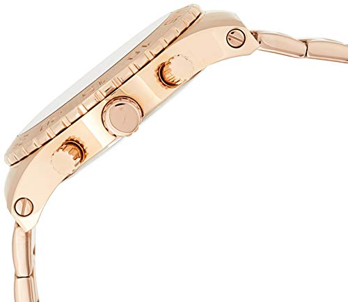 Rose gold tone stainless steel band, 215mm L x 26mm W; Band is adjustable by adding/removing links; Fold over safety clasp