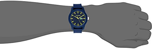 Bring an electric look into the mix with the cool pop of this timepiece from Lacoste™. TR90 composite material and black silicone case. Embossed navy silicone strap. Adjustable buckle closure. Three-hand analog display with quartz movement. Navy dial face features neon yellow hour markers, minute track, brand name, and logo. Water resistant 3 ATM/30 meters. Presentation box included. Imported. Measurements: Case Height: 43 mm Case Width: 43 mm Case Depth: 11 mm Band Width: 19 0⁄1 mm Band Circumference/Length: 8 in Weight: 2 oz