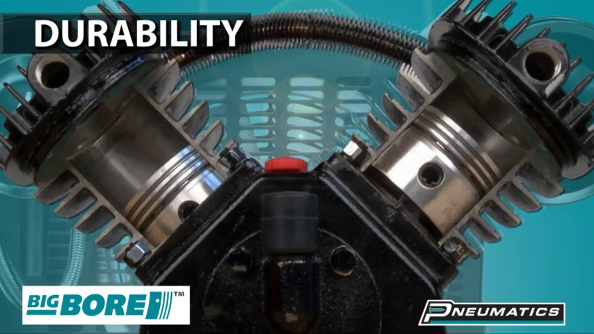 “V” Twin Style Pump runs cooler and provides 12.5 CFM at 100 PSI