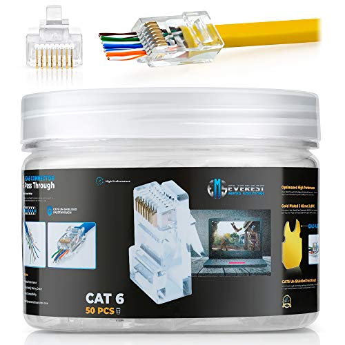 Everest Media Solutions RJ45 Cat6 Pass Through Connectors – Pack of 50 | EZ to Crimp Modular Plug for Solid or Stranded…